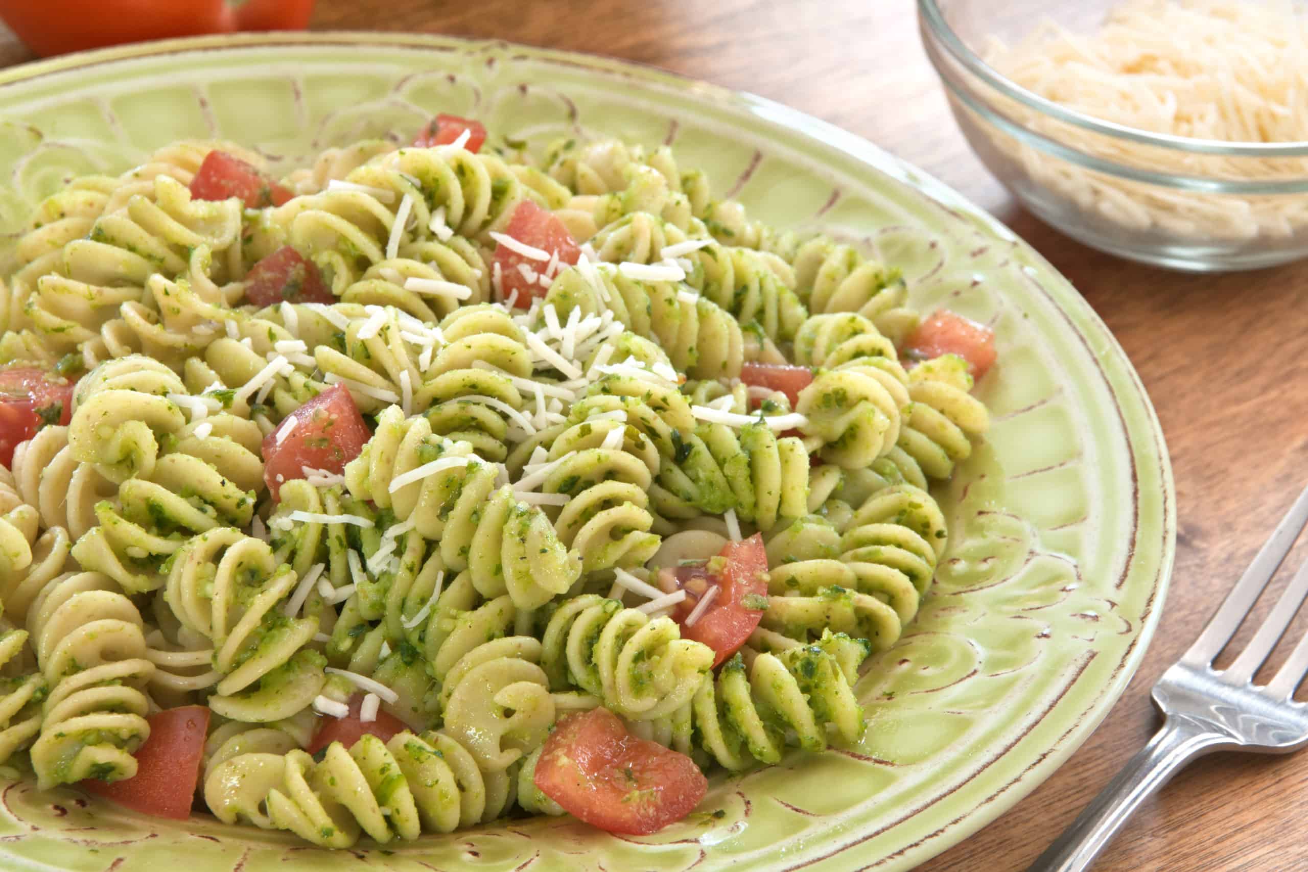 Whole grain pasta has come a long way in the last few years in terms of cost, taste, texture and appearance. Swapping it out for regular pasta in any dish will boost the protein and fiber of your favorite pasta dishes. This pasta dish build on the wholesome foundation of whole-grain pasta with a homemade kale pesto that will give you a new appreciation for the healthful, popular green.
