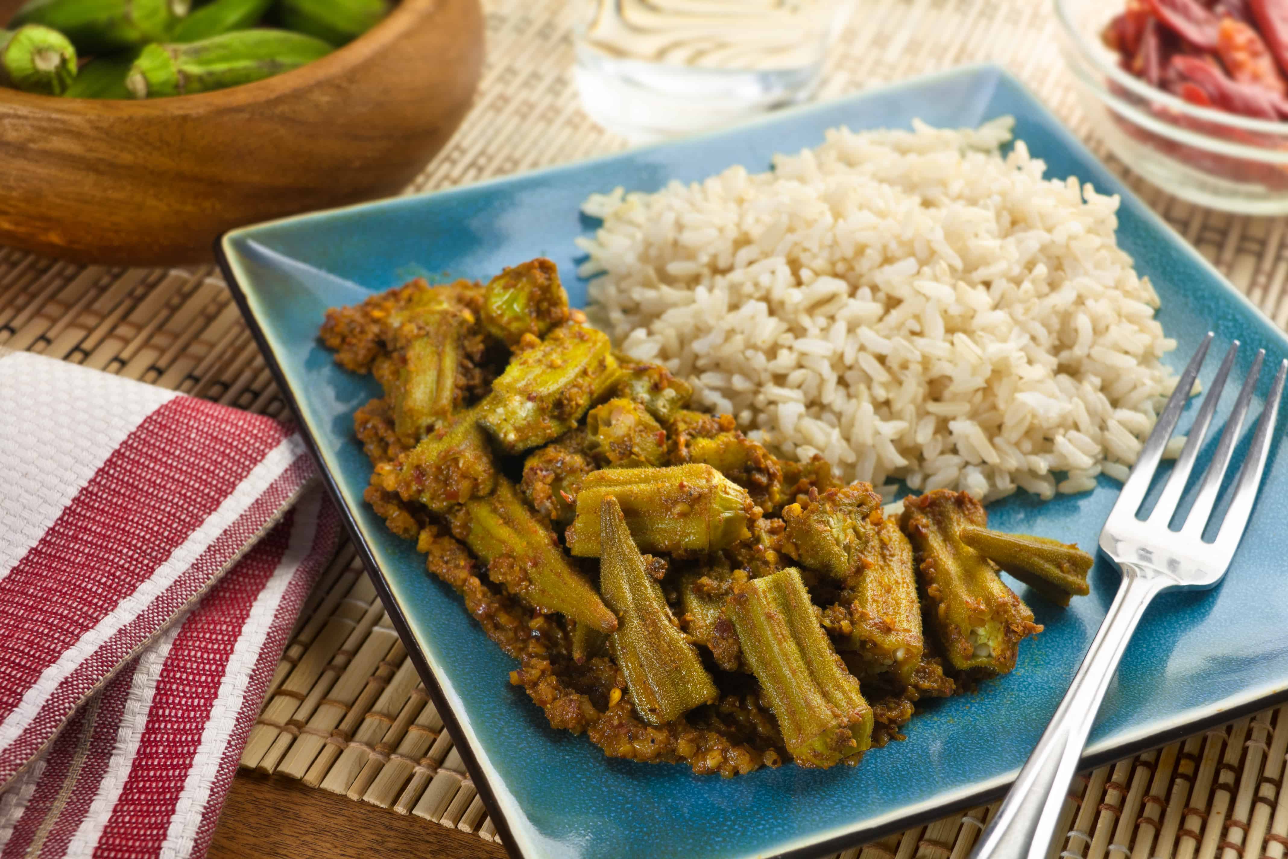 Eating nutritiously doesn’t need to mean eating boring food. Serve this tangy and flaming hot okra curry over brown rice to mellow the heat for a killer dinner option you’ll be impressed with. It’s easy to overcook okra, so for the best texture, boil the okra only 5-6 minutes, finishing the cooking while reducing the liquid. For a milder flavor and easier preparation, use red pepper flakes and ground coriander. If you find the curry to be too hot, try cutting it with a bit of non-fat, plain Greek yogurt.